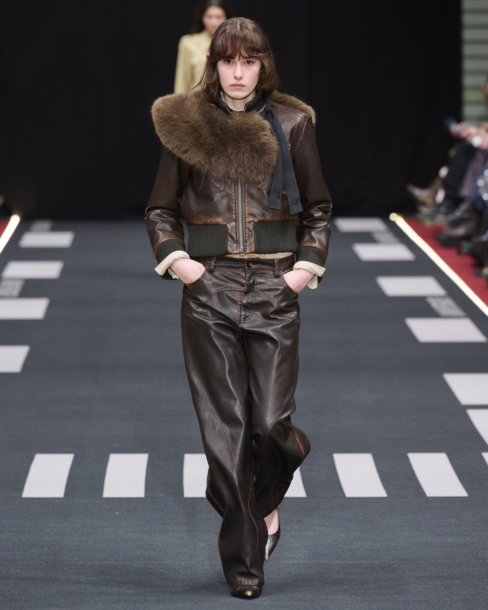 Outerwear spielte eine zentrale Rolle in der Kollektion: Lederjacken, strukturierte Mäntel und oversized Aviator-Silhouetten dominierten das Bild und vermittelten ein Gefühl von Schutz, Stärke und Abenteuerlust. Diese utilitaristischen Elemente wurden bewusst durch fließende Kleider, Spitzendetails, leichte Stoffe und florale Prints kontrastiert, die der Kollektion eine sinnliche, beinahe schwerelose Leichtigkeit verliehen.